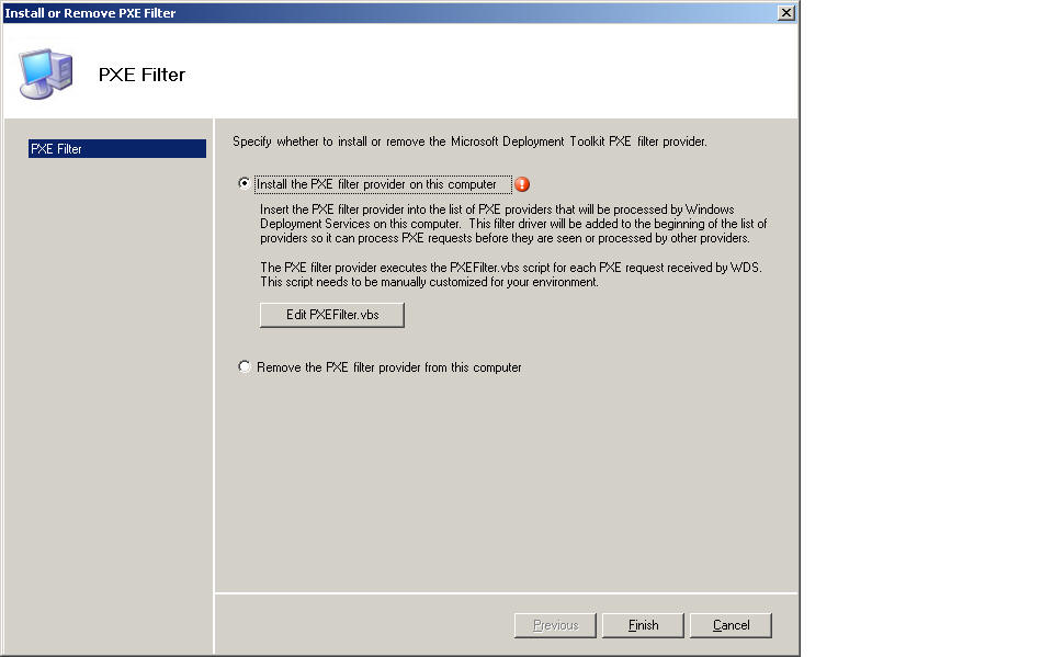 I am trying to configure the PXE Filter script (Start | All Programs | Microsoft Deployment Toolkit | Configure WDS PXE Filter), but when I go to install it I see a red exclamation mark (!) beside the "Install" option.